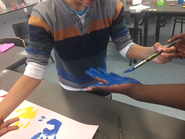 Realizamos também uma outra atividade relacionada com a pintura, que consistia em, pintarmos as mãos dos alunos da multi-deficiência com tintas de várias cores e pressionar as suas mãos sobre a cartolina de modo a obter uma impressão. O principal objetivo foi criar, um género de quadro didático, e no centro colocá-mos uma fotografia relacionada com o tema.